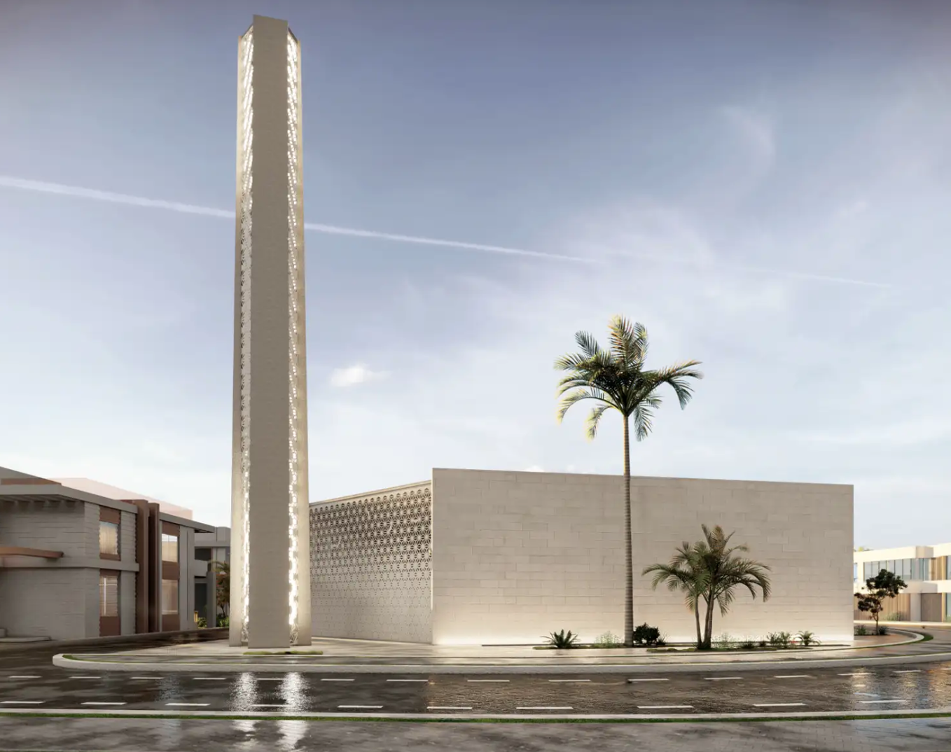 Our Jeddah mosque design blends minimal Islamic patterns in stone with double-height windows, flooding the interior with natural light.